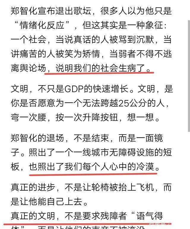 写在最后 郑智化虽然用词不当,言辞激烈了一些,但从维护残疾人权益来说,指出了无障碍环境建设中存在的短板弱项,文明之路远未止于此,需要全社会共同努力创造更加人性化的社会环境。